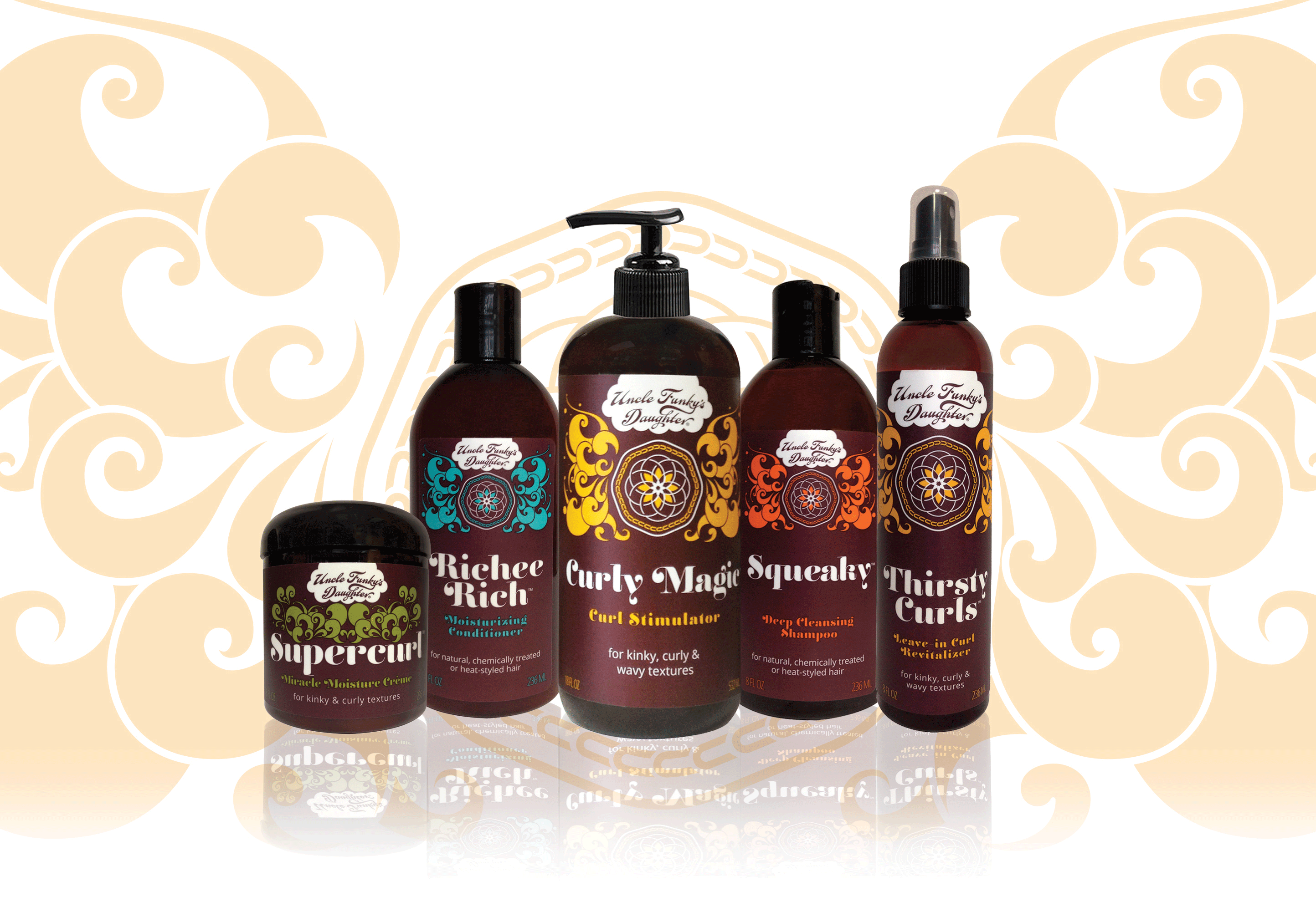 Uncle Funky’s Daughter products are all-natural,100 percent free of paraben, silicone, sulfate, and mineral oil. To help consumers distinguish the purpose of these products, they are categorized into color families. Each color represents a special attribute of the mandala flower.