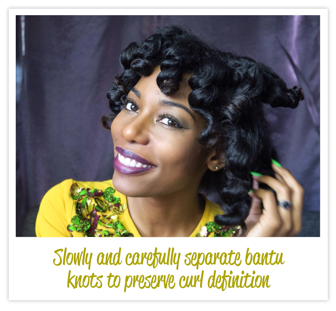 (I don’t like to make them too small because the curls will come out really tight.) I then smoothed the product through each section. Next, I added Good Hair Conditioning Styling Crème and ran my wide toothed comb through the section to remove any tangles. Then, I added olive oil to seal the moisture in and allowed my hair to air dry. Once my hair is dry, I slowly separate my curls to preserve definition and pick out my curls to add volume to my hair. After I remove the bantu knots, I sprayed my hair with Glossy Finishing Hair Polish to add shine and extra moisture protection. And, voila! I have a head full of beautifully moisturized curls.