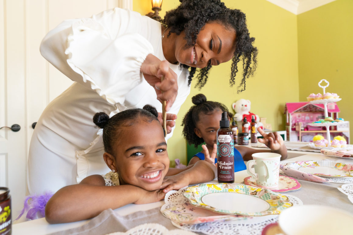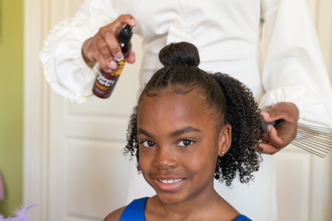 When it comes to styling hair, the same rules apply to children, especially to your daughters. Children are constantly playing, sweating, and accumulating dirt in their hair. As you know, I have three girls, so when transitioning my daughters’ hairstyles, I tend to go for a more protective style like braids in the summer. They are swimming, playing and all around sweating more. So, I tend to hydrate my daughters’ hair as much as I can in the summer by conditioning often and even co-washing after swimming…or grabbing Defunk when I am in a hurry.