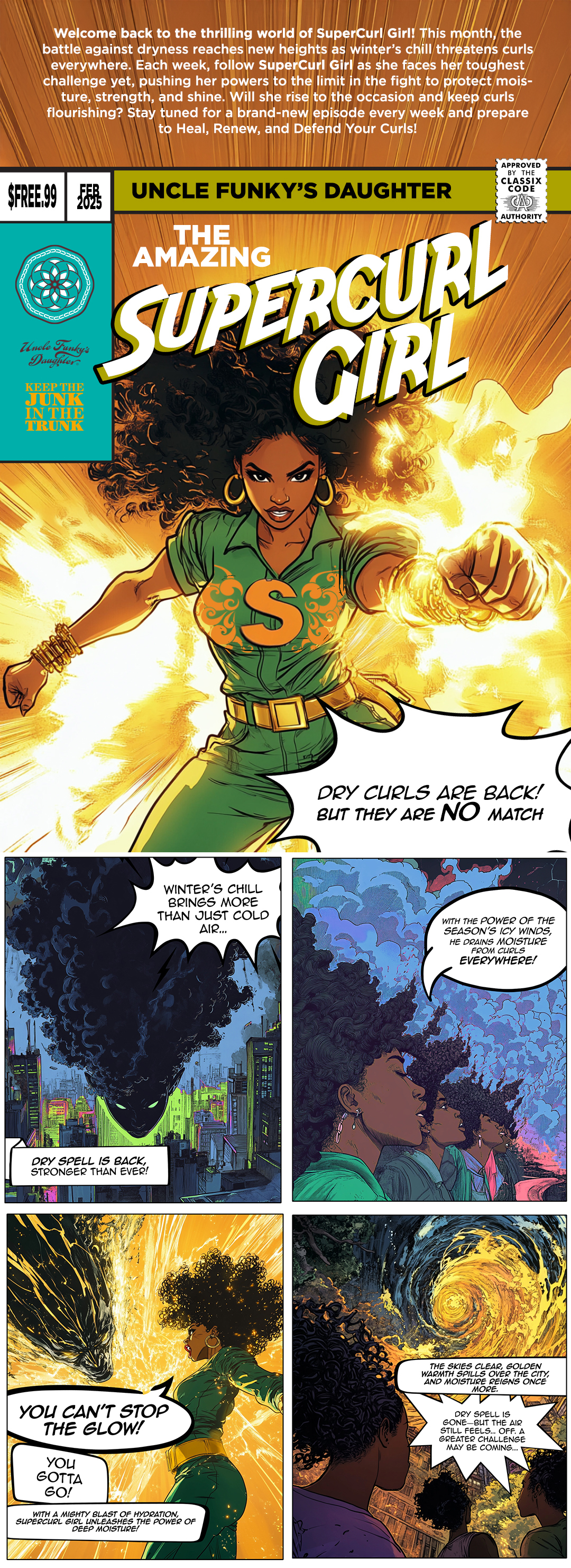 When Dry Spell strikes, curls everywhere lose their moisture and vitality. But Supercurl‘s hydrating power takes it head-on, restoring deep moisture and bringing life back to thirsty curls. Say goodbye to dry, brittle strands and hello to hydrated, healthy hair! Stay tuned for the next chapter!
